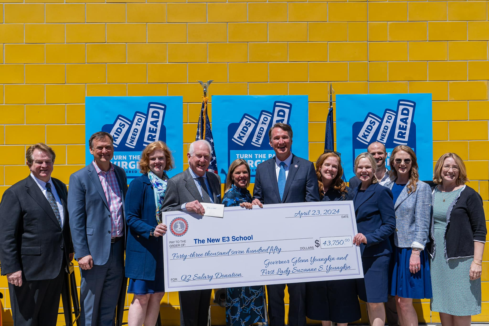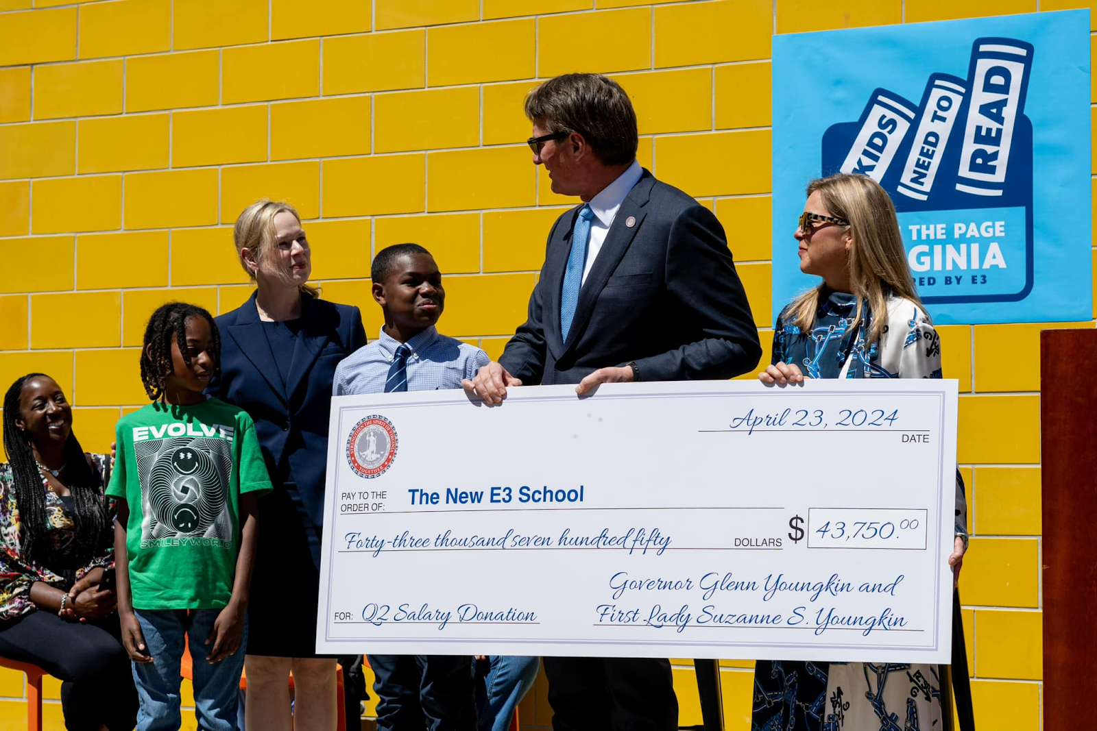 Governor Glenn Youngkin and First Lady Suzanne S. Youngkin donated a quarter of the Governor’s salary to The New E3 School in Norfolk, Virginia. The Governor and First Lady have pledged to donate the entirety of the gubernatorial annual salary to nonprofit organizations doing great work across Virginia and this salary donation furthers that promise.