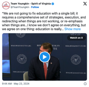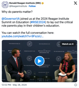 Governor Youngkin spoke at the Ronald Reagan Institute’s Summit on Education and discussed why education is the key to unleashing opportunity and fulfilling the American Dream. Governor Youngkin spoke about the key issues facing parents, students, and the education system at all levels in Virginia and America.